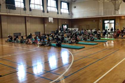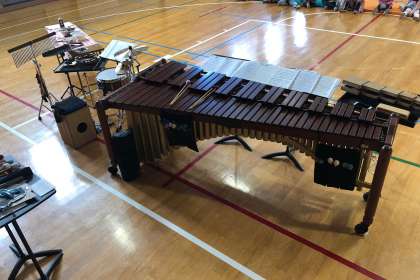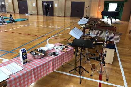 マリンバの演奏者にお越しいただき、5曲ほど演奏してくださいました。台所にある物でを打楽器に見立てて音を出したり、自分の体を使って音を出したりして、とても楽しい時間を過ごしました。密を避けるために、1・2・3年と4・5・6年のグループに分けて聴きました。