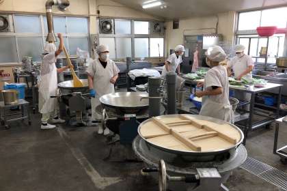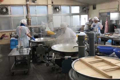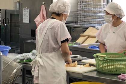 暑さが和らぎましたが、給食室はまだ相当の暑さの中での作業です。皆さんで声をかけ掛け合って、美味しい給食が提供できるよう、業務に努めておられます。