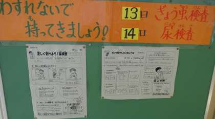 今日13日は検尿・蟯虫検査の回収日です。忘れず持ってきましょう。朝業者の方が回収されます。明日は回収予備日ですが、今日提出するようにしましょう!