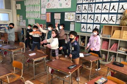 以前に稽古に来てくださった劇団かかしざのみなさんが、来週月曜日に来てくださって3年生が稽古した劇を全体に披露します。今日は、その練習をしました。
