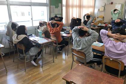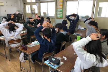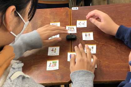 C-NETの先生が、黒板に貼られた思い出の行事のカードを一枚隠して、そのカードは何かを当てるゲームをしました。