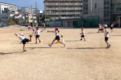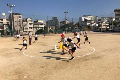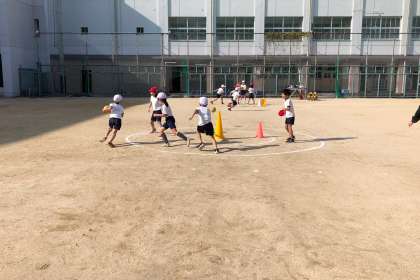 ドーナツ型のコートの真ん中に立てられたコーンをブロックを避けながら、当てるというゲームをしました。