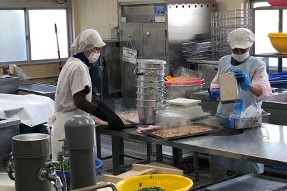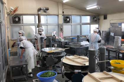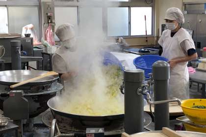 先ずは中学校給食から調理を始めて、その後、自校の給食の調理と、安全に気をつけながら時間に追われる業務です。