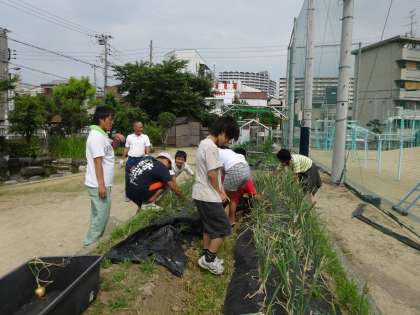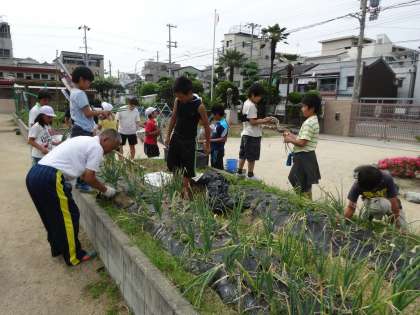 今日は、たまねぎ・紫たまねぎの収穫等をしました。毎月の委員会で作業をするだけでなく、毎日委員会で当番の児童が水やりをしました。校長先生や管理作業員さんも手を入れてきて無事収穫となりました。けっこうな量になりました。