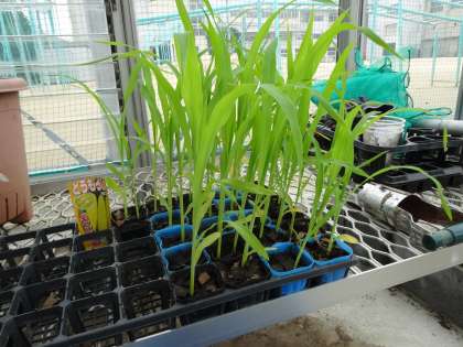 上、中:6年生の「トウモロコシ」の栽培です。種子から植え、温室内で育苗したのち今週、定植しました。7月中旬には収穫できるかな?