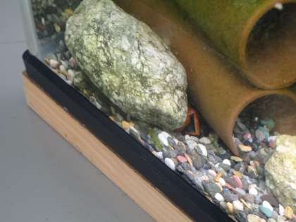 下:「番外編」先日から八幡屋の住人となった「サワガニ」です。玄関の水槽がお住まいです。だいぶ慣れてきましたが、岩陰がお好きなようです♪写真では「足」がちょっと見えています、わかるかな?