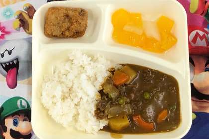 本日のメニューは、カツカレーでした。ご飯を増やしたい子どもたちもけっこういました。
