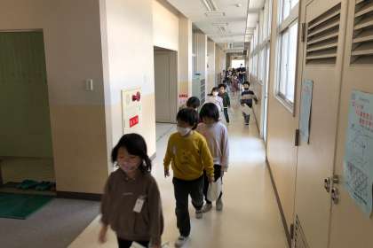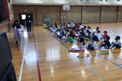 学校探検をスタートする前に、2年生の子どもたちから挨拶がありました。案内が終わると、2年生が探検カードにシールを貼りました。