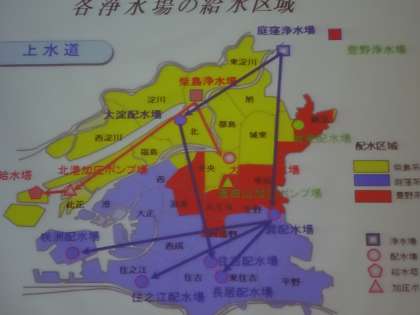 上段:大阪市の水は、3つの浄水場から送られます。港区の水は、守口市にある庭窪浄水場から送られています。