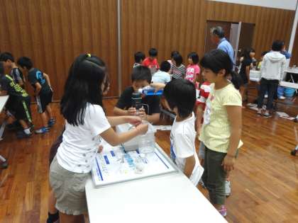 中・下段:水をきれいにする仕組みを実験を通して勉強しました。泥水を砂の層でこしてきれいにしたり、青い水を活性炭で透明な水にしました。飲み水にするには、さらに殺菌しないとだめだそうです。