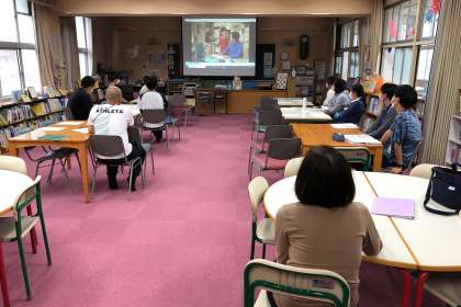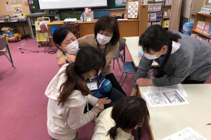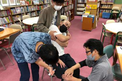 教員がそれぞれ役になり、エピペンを打つ練習をしました。