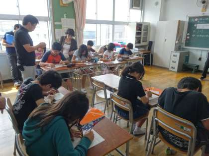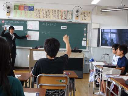 「分数のかけ算を考えよう」の単元で、面積図を使って「分数×分数」の計算の意味を考えた後、問題練習をしました。電子黒板も使って、視覚的に理解できる工夫もしました。子供たちもよく頑張っていました。
