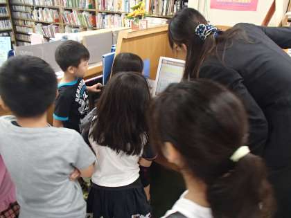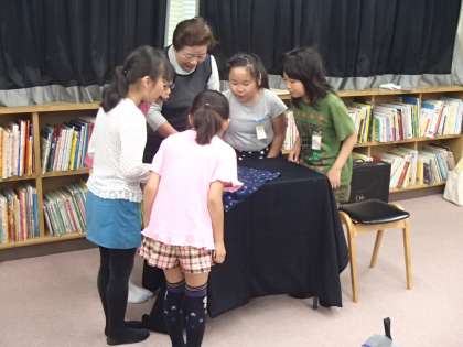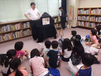 中段:館長さんが紙芝居で図書館について説明していただきました。