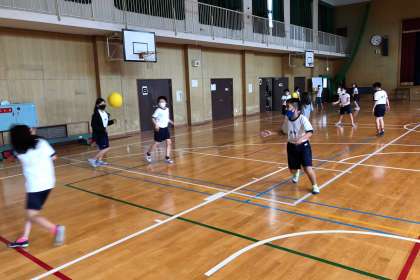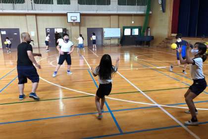 グループのみんなが動きながら、ボールをパスする運動をしています。