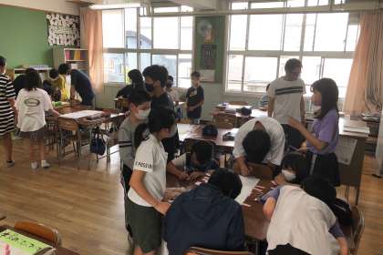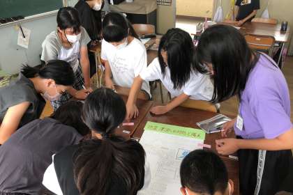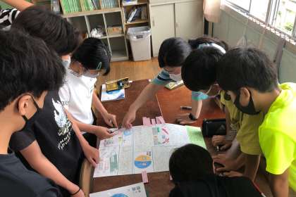班で作成した防災ポスターについて、他の班のを見て回り付箋にコメントを書きました。