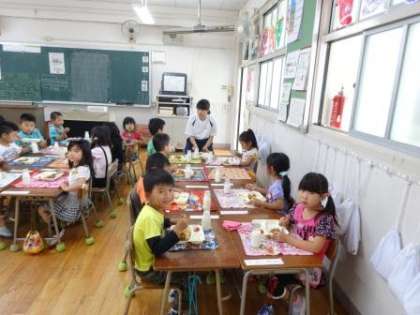 上段:給食は2日間とも教室で児童と一緒に食べました。