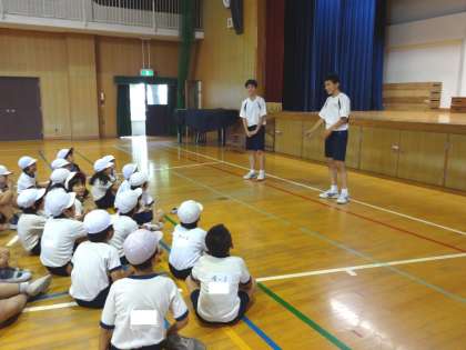 中段:体育の授業で鬼ごっこをしたり、英語の授業をちょっとしたり、紙芝居をしたりと各学級で時間をもらって児童全員を相手にミニ授業をする経験をしました。