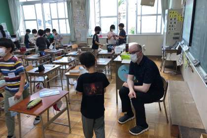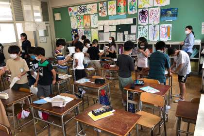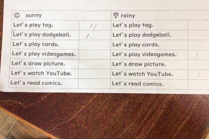 晴れた日、雨の日にどんな過ごし方をするかを聞いて回る活動をしました。子どもたちは、少しでも多くの友だちに聞こうと、あちらこちらに行ってはとても楽しそうに会話をしていました。