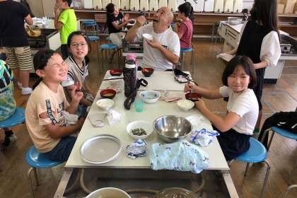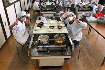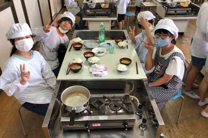 お味噌汁とお米を炊く調理実習をしました。やっと完成!「いただきます」