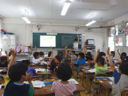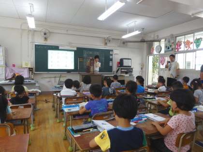 「のこりはいくつ ちがいはいくつ」の単元の授業をしました。パソコン・プロジェクターを使って絵や図を拡大してわかりやすく提示したり、20玉そろばんを使ったりしながら、「数の大小関係」を児童に意識させました。そうして、ひき算を使って文章題を解く手順を理解させました。暑さの中、子供たちはてきぱきと学習していました。