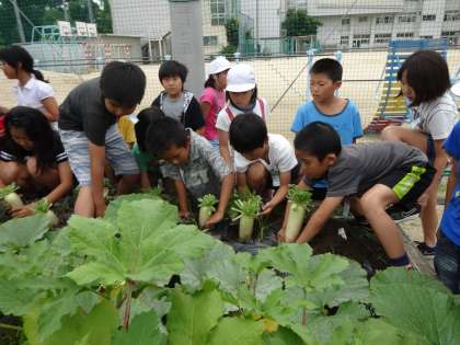 梅雨の合間をねらい、春に植えた「夏ダイコン」を6月30日に4年生が収穫しました♪