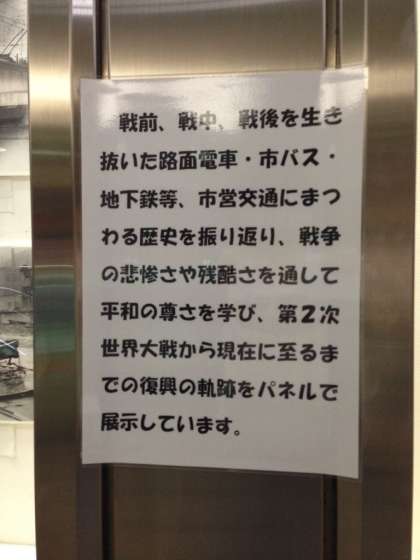 みんなで折った折り鶴をM先生が代表として心斎橋駅に届けて、展示していただきました。空襲時の様子や市営交通の歩みの写真も展示されています。