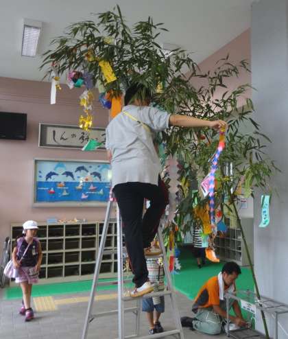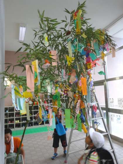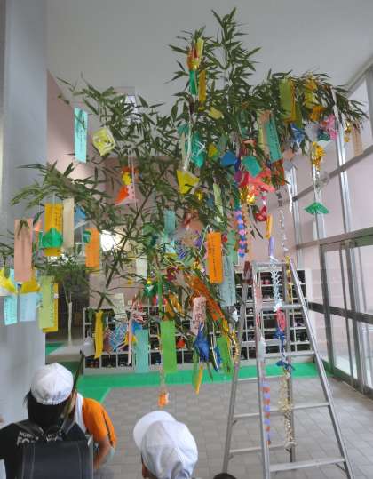 1・2年生が作った七夕飾りをつけて、玄関に飾っています。懇談会で来校された時にご覧ください。