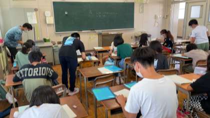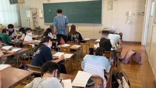 今日の放課後学習は高学年が対象です。教育実習生2名も一緒に子どもたちに勉強を教えてくれました。1人は6年生の教室で学んでいます。