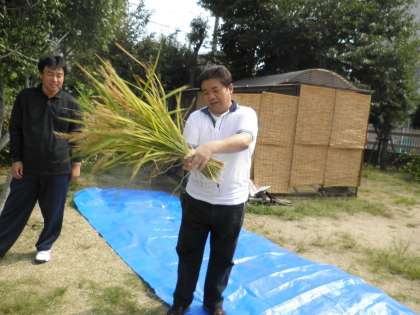 1週間から10日間ぐらい干すことによって、葉や茎、モミに残っていた水分がなくなりおいしいお米になっていきます。また、脱穀もしやすくなります。