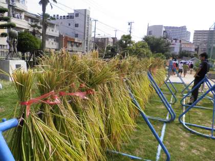 自分たちが植えた5株ずつ刈り取った後は、根元をしっかり束ね、さかさまにして天日干しします。竿の代わりは鉄棒です。