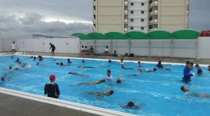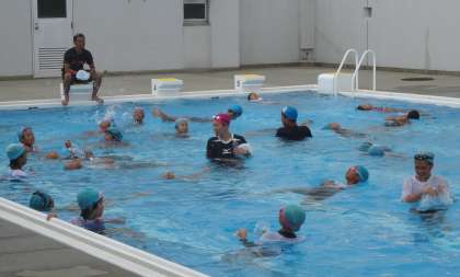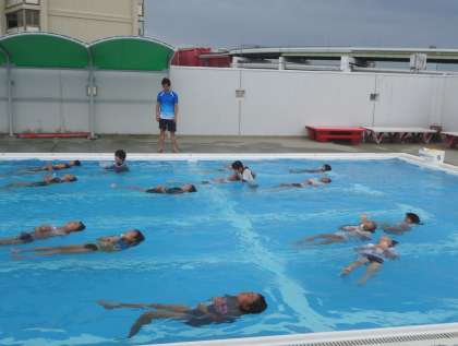 八幡屋小学校の5・6年児童が、港中学校の体育科の3人の先生に、着衣水泳の指導をしていただきました。楽な浮き方や泳ぎ方の指導の後、水着の上にTシャツを着て、ふだんより体が重くなった状態で浮いたり泳いだりしました。ペットボトルなどを使って、楽に浮く方法も教えていただきました。「水の中では、あわてて動かず、力を抜いて、まず浮かぶ。」「他人を助けるときは、まず、ペットボトルなどの物を投げて助ける。」などいざというときに身を守る方法を教えていただきました。