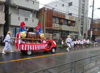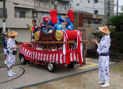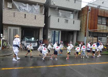 昨日からの雨がまだ残っていましたが、三津神社の夏祭りの巡行が八幡屋小学校に来てくれました。