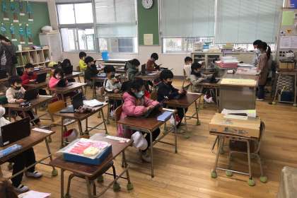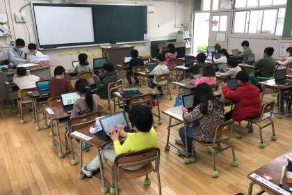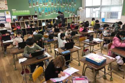 PCで学習をしながら、通知表をもらう順番を待ちました。