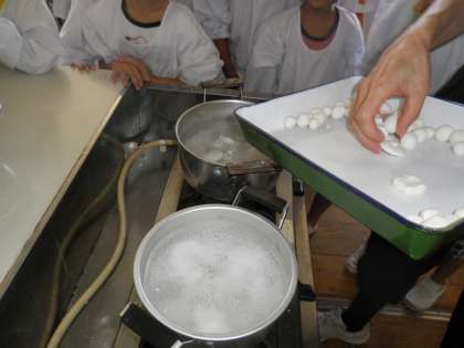 1.2年生の子どもたちに、日本の伝統的な季節の行事を知ってもらおうと、9月19日(木)中秋の名月の日に、月見団子を作りました。みんなで粉をこねて丸め、ゆでた後に、きな粉とあんこをまぶしました。9月の満月の日に、お団子を供えたりススキを飾ったりして、お月見をするのを初めて知った子どもたちがほとんどでした。