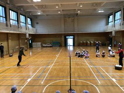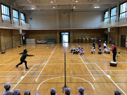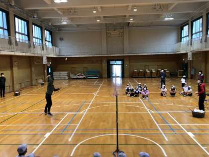 はじめに、選手のプレーを見せてもらいましたが、子どもたちは、シャトルを打つ音や飛んでいくスピードに「えぇーすげぇー」の連発でした。