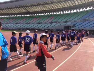 ヤンマースタジアム長居で「大阪市小学生スポーツ交流大会」総合開会式がおこなわれました。小学生2000名が参加し、八幡屋小学校の児童も参加しました。この後、サッカー・卓球の会場でも開会式が行われ、まもなく試合が始まります。