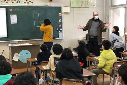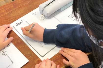 ペアで一人がめかくしをして、もう一人が進む方向を英語で指示を出してゴールにたどり着くかのゲームをしました。