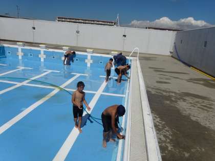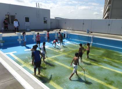 子供会の方とソフトボール・キックの児童とで、今週末の校庭キャンプに向けて、プールそうじをしました。おかげで藻が出てきたプールもきれいになりました。