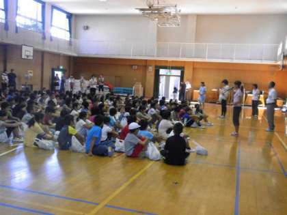 高学年と低学年に分かれた縦割り班では、水消火器、スモークハウス、液状化実験、心臓マッサージ(高学年のみ)の体験学習を実施しました。また、地震・津波のメカニズムと命を守る方法について学習をした後、実際に津波を想定して3階まで避難しました。子どもたちは、楽しく体験学習を行うとともに真剣に避難訓練を行うことができました。