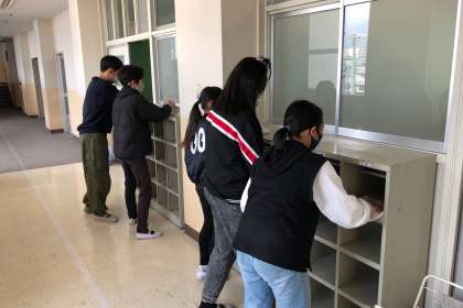 班ごとに分かれて、教室以外の靴箱の中を拭き掃除をしました。