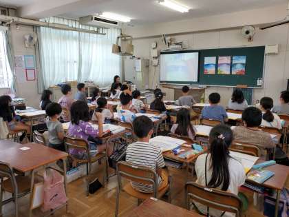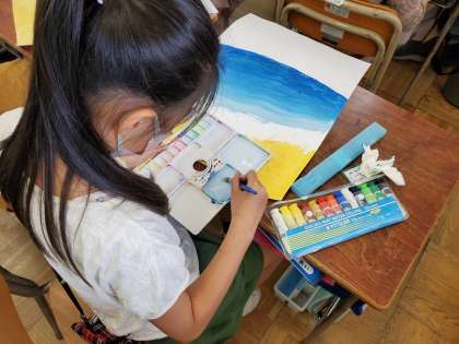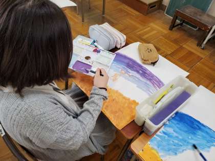 「空と海と花」というタイトルで水彩絵の具を使い、グラデーションの技法に取り組みました。