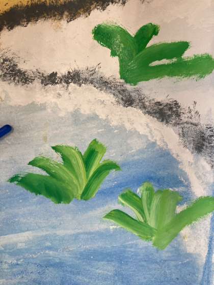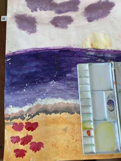 海の絵を描いています。来週の完成に向けて、最後に花を描き入れているところです。海のグラデーションがとてもきれいです。