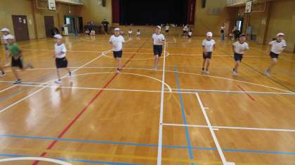 体育館で20メートルシャトルランを行いました。子どもたちは精一杯自分の力を出し切りました。