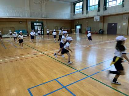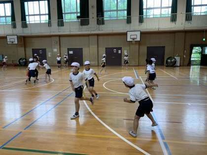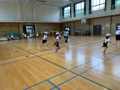 体育の時間にタグラグビーを行いました。鬼ごっこ形式で相手のタグをとるゲームをし、楽しんで活動していました。