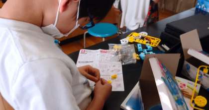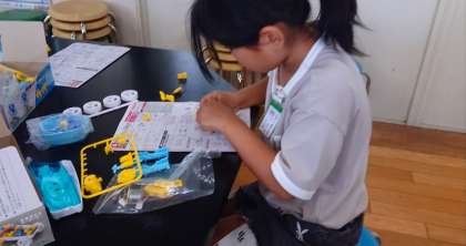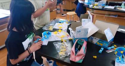 部品を組み立てて扇風機を作りました。カチッとはまらないときがあり「なんでや?!」と一生懸命考えていました。電池を反対向きに入れると、羽も反対に回ることを発見しました。