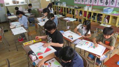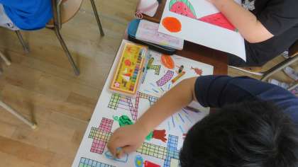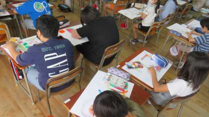 子どもたち一人ひとりの名前をもとに文字アートを描いています。ドットや幾何学模様などそれぞれ工夫をして取り組んでいます。
