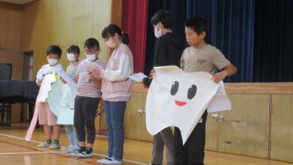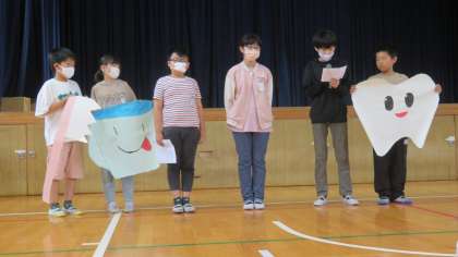 今週は八幡屋小学校「歯と口の健康週間」です。児童朝会で、健康美化委員会の児童が取り組みについての説明をみんなの前で行いました。食事の後に歯を磨くことを今週1週間で習慣づけていきます。ご家庭でもお子様に声掛けをお願いします。