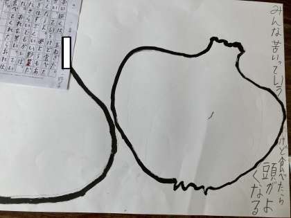野菜の絵を大きく筆を使って書き、周りに野菜の気持ちを書きました。