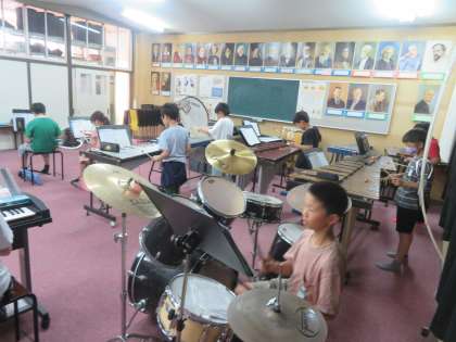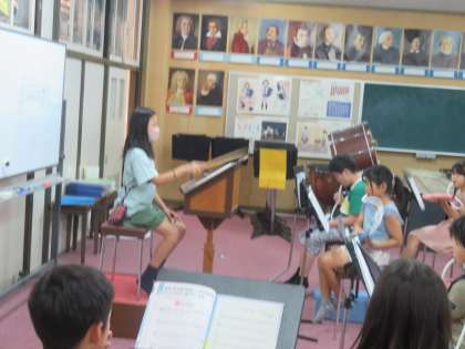まきばの朝を合奏しました。港中学校の先生が授業見学に来ました。