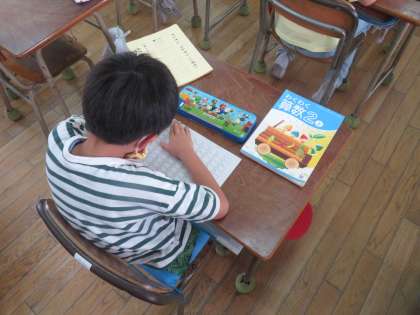 算数の授業の初めに足し算や引き算などの問題を1分計って解きます。